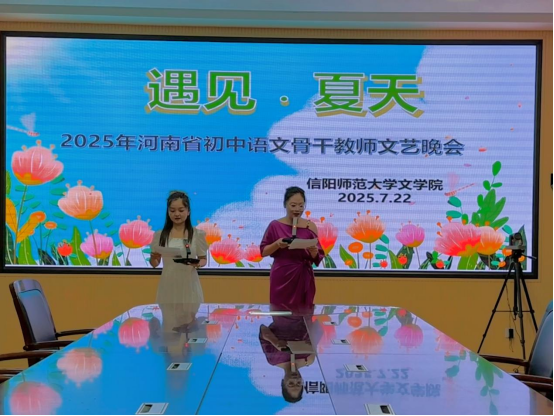 2025年7月22日晚,“省培计划(2025)”初中语文省级骨干教师培育项目文娱晚会于人文楼三楼会议室顺利举行。晚会由文艺委员陈阳与学员冯兰兰共同主持,全体学员齐聚一堂,共赴这场文艺盛宴。