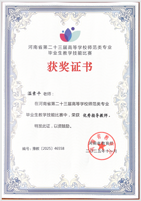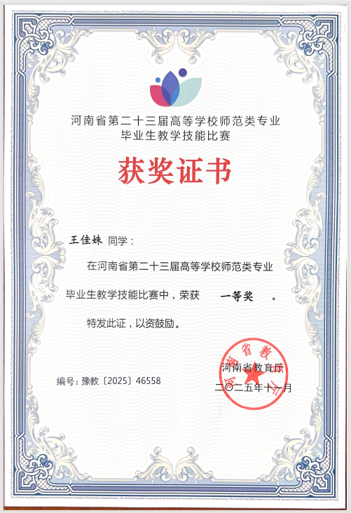在这场高规格、高强度的省级赛事中,我院2022级汉语言文学专业学子表现突出:王佳姝获中学组语文一等奖,刘亦文获小学组语文二等奖,指导教师温素平获评 “优秀指导教师奖”,彰显了我院师范人才培养成效。未来,我院将持续以赛事为抓手,优化师范生培养体系,为基础教育输送更多高素质师资。