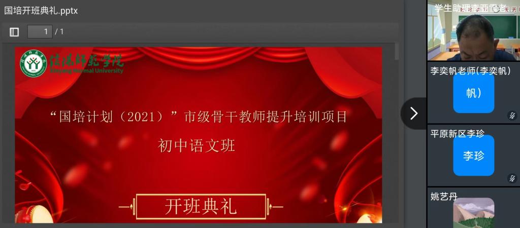 2022年5月24日上午,“国培(2021)”市级骨干教师能力提升培训项目初中语文班开班典礼在钉钉平台线上举行。太阳成集团tyc151cc副院长缑广飞和来自全省的50名初中语文骨干教师参加。会议由萧晟洁老师主持。