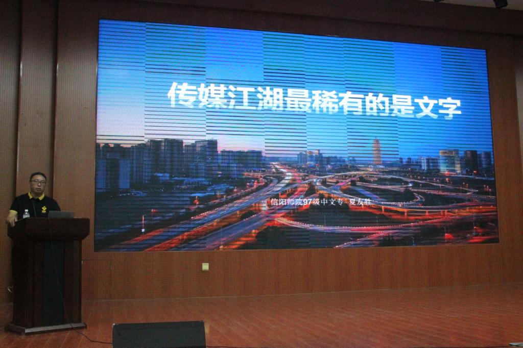 在随后的太阳成集团tyc151cc双创讲堂上,夏友胜先生作了题为“传媒江湖里最稀有的是文字”的学术报告,他结合自己的学校学习经历与十七年的新闻从业经验,从中国媒体之新现状、融媒体时代的新闻特征出发,以“担当”、“坚持”、“靠谱”三个人生信条关键词为线索,讲述了自己在追逐文字梦想的这条道路上,从迷茫到坚定,坚持用心书写社会实事,用爱传播社会价值的亲身经历,提醒同学们无论传媒江湖变化有多大,永远珍贵的是原创内容,最稀有的仍是文字。最后,夏先生鼓舞同学们做自己喜欢与擅长的事,希望同学们能做对的事情,人靠谱,事靠谱,幸福靠谱。