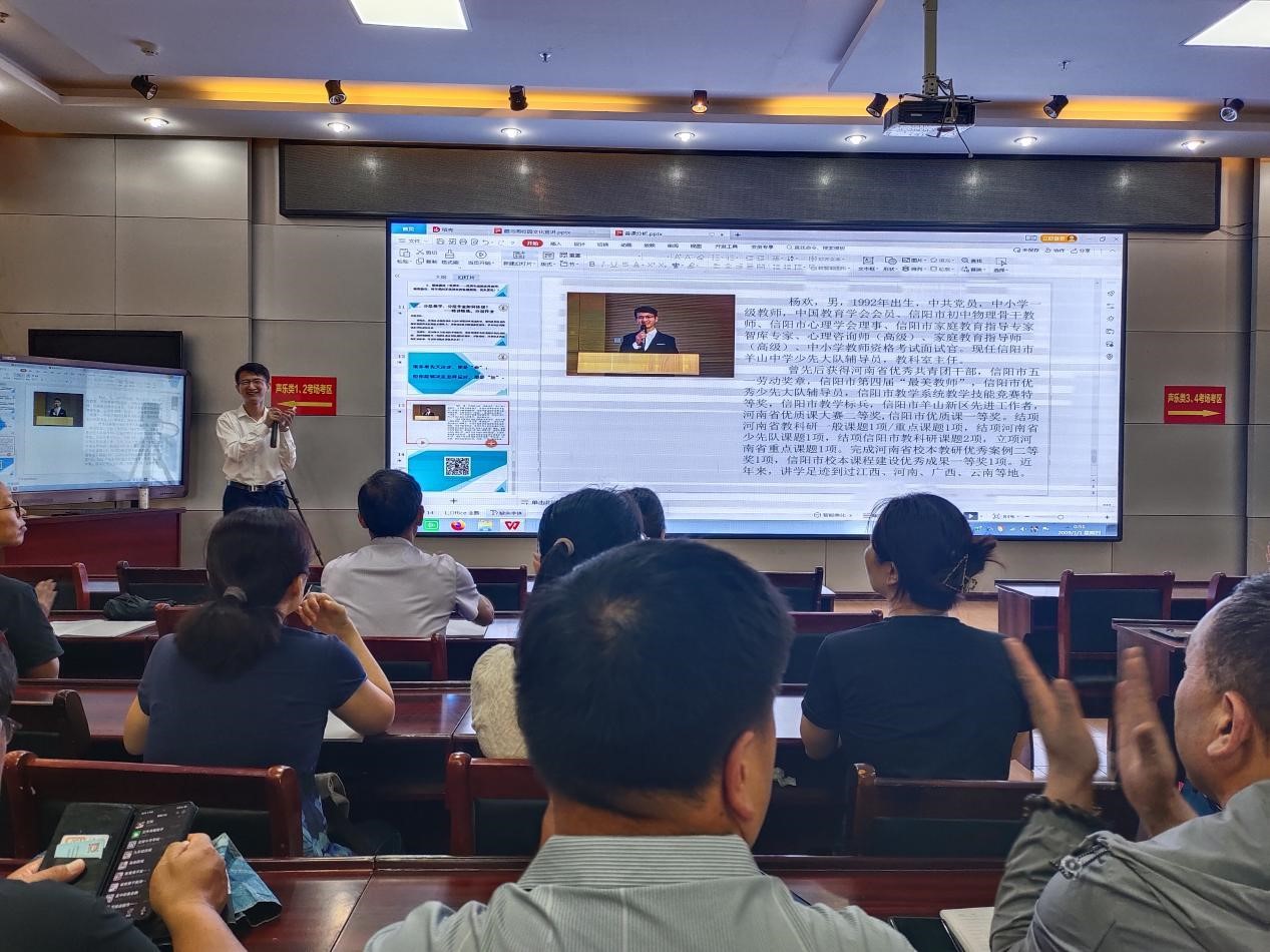 在会议室,教科室主任杨欢老师为大家做了一次精彩的分享。杨老师为大家介绍了“备课”,指出备课目标是有效课堂到高校课堂,主要包括课堂模式、教材如何取舍、分层教学分层作业如何体现三个方面,分别对应着“三段六步”教学模式、三次备课、精讲精练、分层展示。