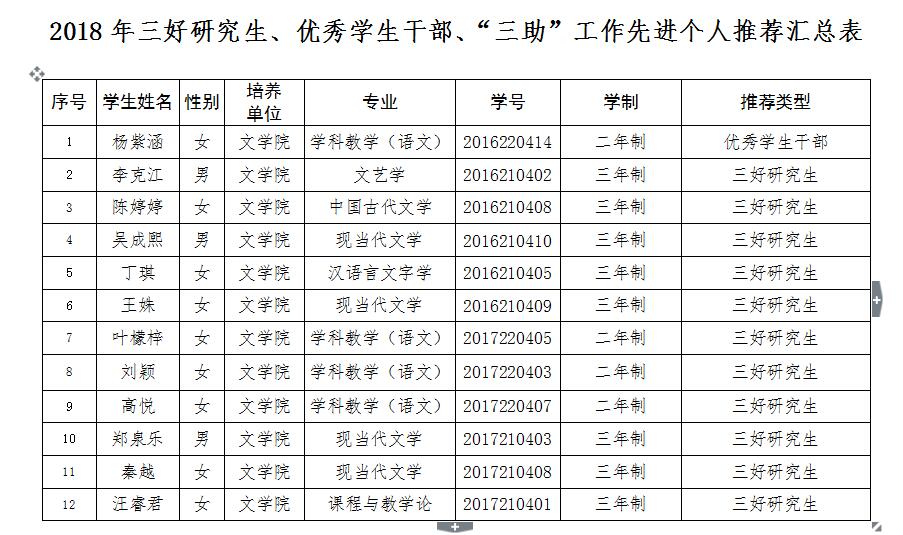 根据学校《关于评选2018年信阳师范学院三好研究生、优秀学生干部、“三助一辅”工作先进个人的通知》文件精神,我院积极组织,客观公正地开展评选工作,现将拟推荐名单公示如下: