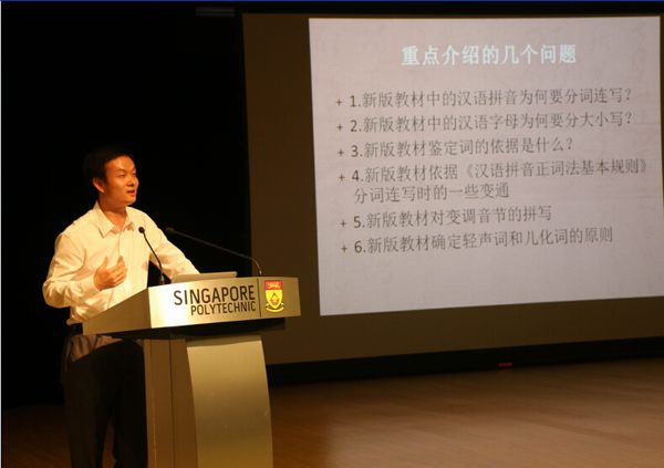 9月16日,应新加坡教育部课程规划与发展司邀请,我校特聘教授刘振平博士为新加坡小学华文部主任会议做了题为“新加坡新版小学华文教材中的汉语拼音拼写”的大会报告,全面阐释了新加坡新版统编教材(2015)在汉语拼音拼写方面的改革和依据,并对新加坡汉语拼音教学提出了指导性意见。来自新加坡全国200多所小学的华文部主任、教师代表聆听了大会报告,并与刘振平博士做了深入的交流。