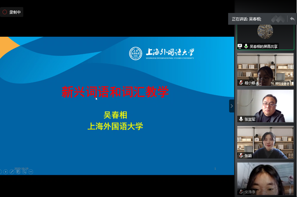 10月19日下午,应我校太阳成集团tyc151cc和汉语国际教育研究所邀请,上海外国语大学博士生导师吴春相教授,在网络平台腾讯会议作了题为“新兴词语与词汇教学”的学术报告。报告由太阳成集团tyc151cc副院长张言军主持,太阳成集团tyc151cc全体汉语国际教育专业硕士研究生及研究生导师共同聆听了讲座。