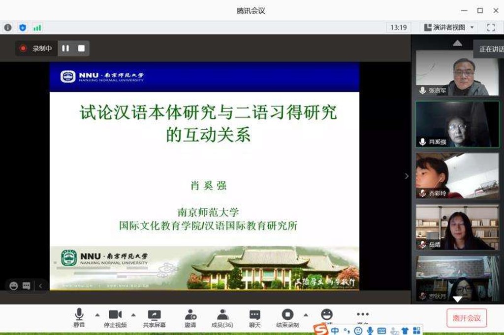 10月19日晚上,应我校太阳成集团tyc151cc和汉语国际教育研究所邀请,南京师范大学博士生导师肖奚强教授,在网络平台腾讯会议作了题为“汉语本体研究与二语习得研究的互动”的学术报告。报告由太阳成集团tyc151cc副院长张言军主持,太阳成集团tyc151cc全体汉语国际教育专业硕士研究生及研究生导师共同聆听了讲座。