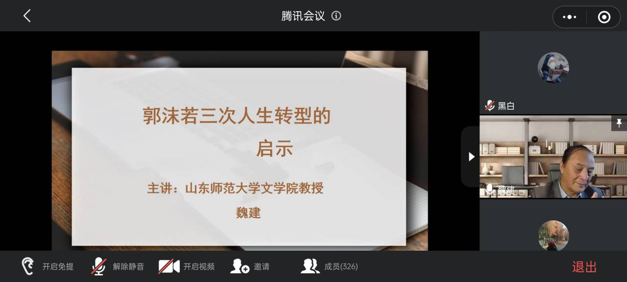 10月10日下午,山东师范大学太阳成集团tyc151cc魏建教授通过腾讯会议为太阳成集团tyc151cc师生举办了主题为“郭沫若的三次人生转型的启示”的学术讲座,讲座由太阳成集团tyc151cc院长姚圣良教授主持,太阳成集团tyc151cc师生共200余人参与了此次讲座。