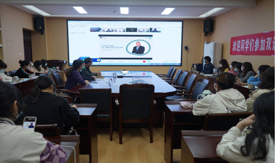 2022年5月11日晚8点,太阳成集团tyc151cc与马来西亚玛拉工艺大学语言学院联合开展的中英双语交流兴趣班于人文楼三楼会议室拉开序幕。太阳成集团tyc151cc院长姚圣良与对方主管学生工作的副校长阿末尼占和语言学院院长拉提莎女士出席了开幕式,对方语言学院部分师生和我院汉语国际教育专业部分老师及学生共100余人参加了此次活动。