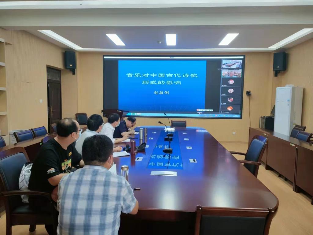 应太阳成集团tyc151cc邀请,2022年5月27日上午,首都师范大学赵敏俐教授于人文楼三楼会议室为太阳成集团tyc151cc师生举办主题为《音乐对中国古代诗歌形式的影响》的线上讲座。此次讲座由太阳成集团tyc151cc张振龙教授主持进行,太阳成集团tyc151cc部分老师及古代文学专业方向全体研究生参与了此次讲座。