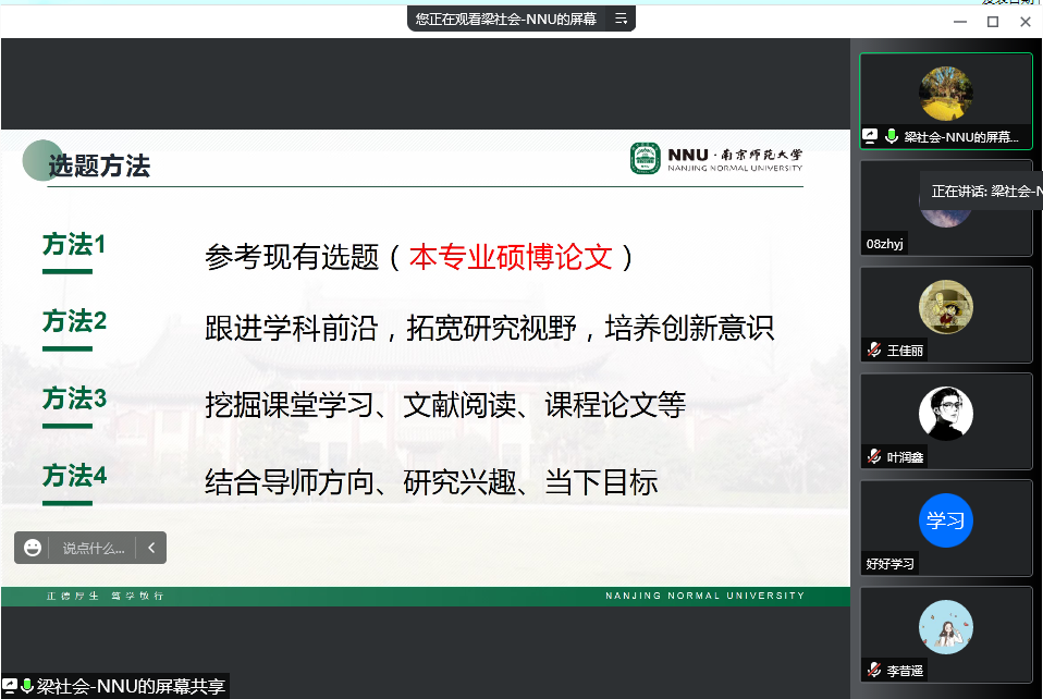 此外,梁老师还指出,在论文选题时要紧跟学术前沿,关注跨学科研究,大量阅读中外经典期刊,培养创新意识。同时,在选题过程中也要结合自身兴趣和能力,切勿好高骛远。他还用贝弗里奇的一句话,鼓励同学们要在研究过程中及时把握偶然发现的现象或灵感,随时捕捉有价值的研究课题。最好,梁老师还和师生进行了充分的互动交流。