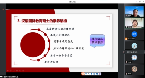 互动环节,曹秀玲教授还结合“国际中文教育与国家文化软实力”的话题向同学们阐释了汉语国际教育专业的光明未来。并分析了汉语本体研究与对外汉语教学之间的相互依存关系,提出要在汉语教学实践中发现的新问题,以此构建国际中文教育教学和科研双向良性互动格局。