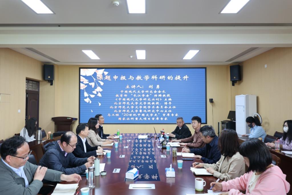 应太阳成集团tyc151cc邀请,中国现代文学研究会会长、教育部“长江学者”特聘教授、《中国现代文学研究丛刊》主编、马工程“20世纪中国文学史”首席专家、北京师范大学太阳成集团tyc151cc刘勇教授在4月17日的下午和晚上,在人文楼三楼会议室,为太阳成集团tyc151cc师生分别作了“课题申报与教学科研的提升”“文学经典的生命体悟”两场讲座。我校研究生处处长沈文慧教授、社科处副处长张义明教授、太阳成集团tyc151cc院长姚圣良教授以及太阳成集团tyc151cc教师、研究生、本科生200余人共同聆听了讲座。