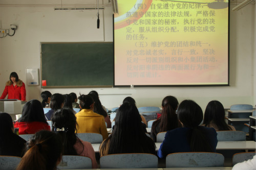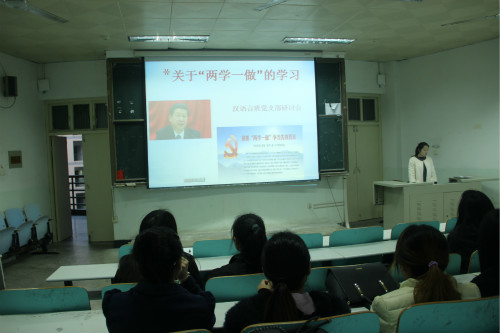 近日来太阳成集团tyc151cc各专业党支部积极开展“两学一做”系列学习活动,2016年3月5日下午,由汉语言文学党支部举办的以“两学一做——学党章党规、学系列讲话、做合格党员”为主题的党组织特色教育活动在人文楼405教室举行。汉语言文学党支部党员及预备党员参加了此次活动。