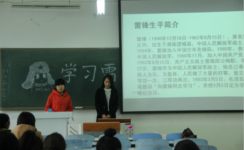 班会上,各班根据自身情况不同,紧抓学习雷锋精神重点,开展了形式各样的班会活动。汉语言班以学唱雷锋歌曲作为班会的开始,嘹亮的歌声表达了同学们对雷锋同志深深的敬意,同时以雷锋事迹和名人名言激发同学们身体力行,响应学院号召,学做雷锋,践行当代大学生使命的强烈愿望。汉语言文学二班播放了有关雷锋事迹的影片,并让同学们相互交流,发表自己对雷锋精神的理解,有同学谈到:"雷锋精神说到底就是积极生活、努力进取、艰苦奋斗,在完善自我的同时做好自己的本职工作。"其班长也说到:"雷锋精神在任何时代都不过时,我们要时刻树立'物以善小而不为'的理念",并通过自身接受别人帮助的事迹感染同学们向雷锋同志学习,最后,她希望同学们在学习中也能弘扬雷锋精神,明确学习的目的,互帮互助,共同进步。