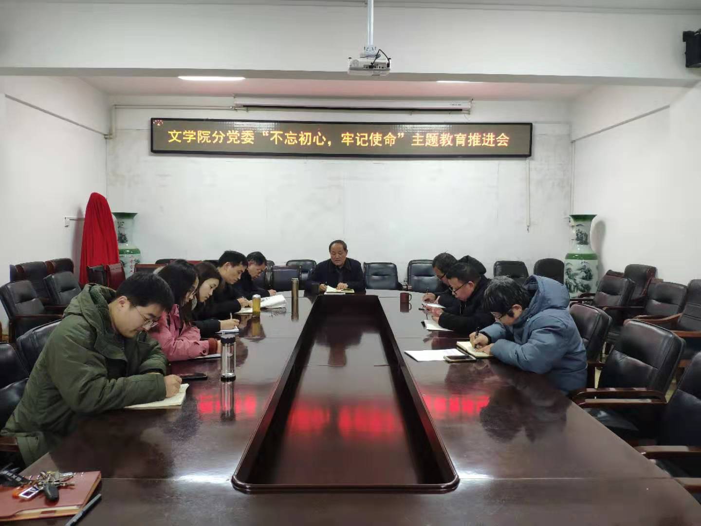 12月24日下午,太阳成集团tyc151cc分党委在3-11会议室召开“不忘初心、牢记使命”主题教育推进会。太阳成集团tyc151cc全体党支部书记参加,会议由党委书记吴圣刚主持。