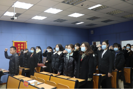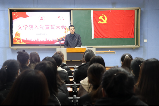 12月3日下午6点,太阳成集团tyc151cc2021年下半年入党宣誓大会在人文楼407隆重举行。太阳成集团tyc151cc党委书记王振海、党委副书记王家宏、副院长缑广飞、组织员陈辉、辅导员柳家琪以及各支部书记、新老党员、入党积极分子参加宣誓仪式。党委副书记王家宏主持仪式。