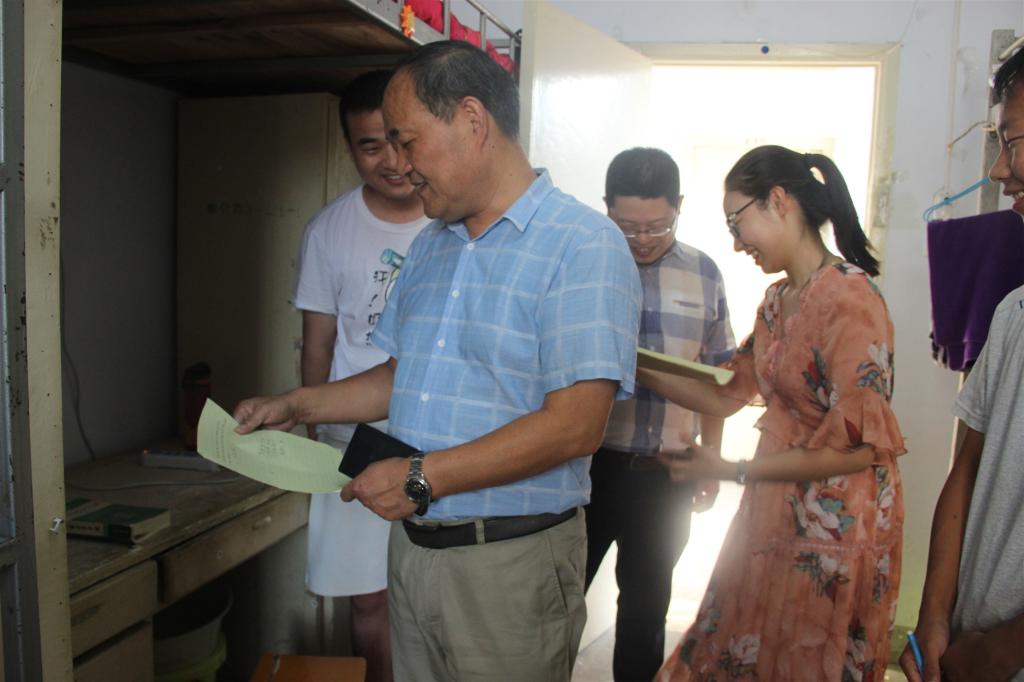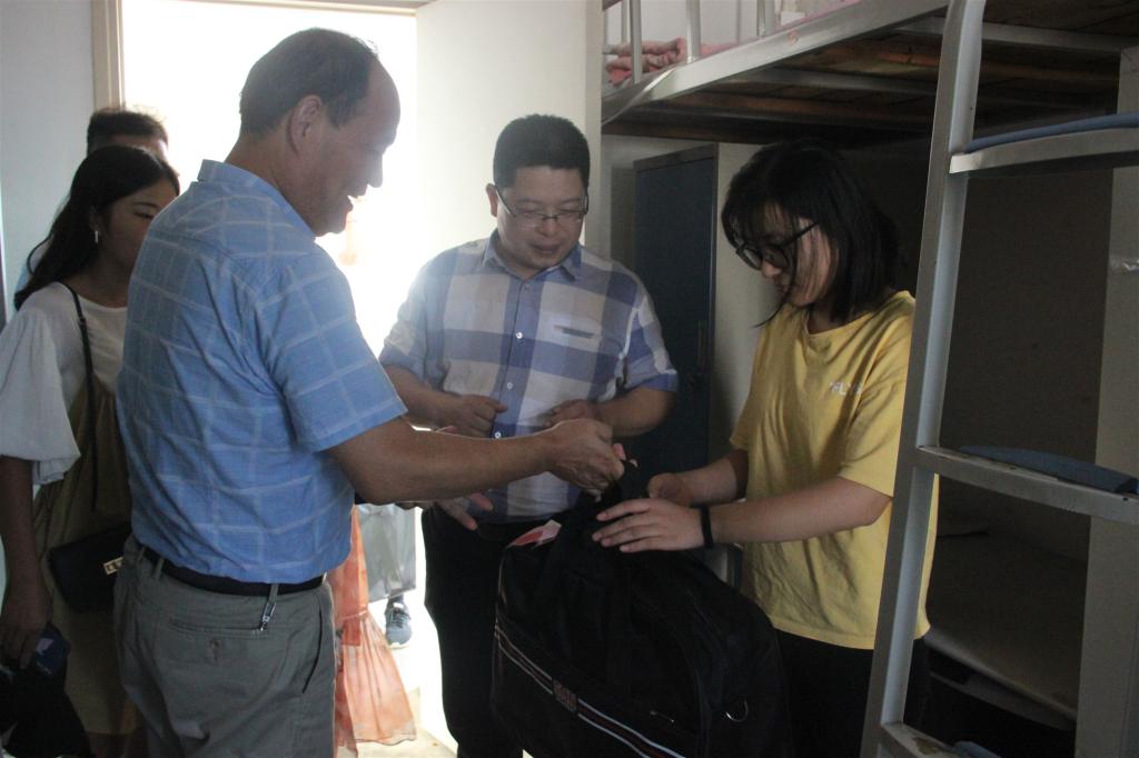 (本网讯王凯贺 李慧)9月8号下午,太阳成集团tyc151cc党委书记吴圣刚、副书记杨乐和19级新生辅导员郭子悦老师一行先后走访2019级4号楼男生宿舍和16号楼女生宿舍,看望慰问新同学。