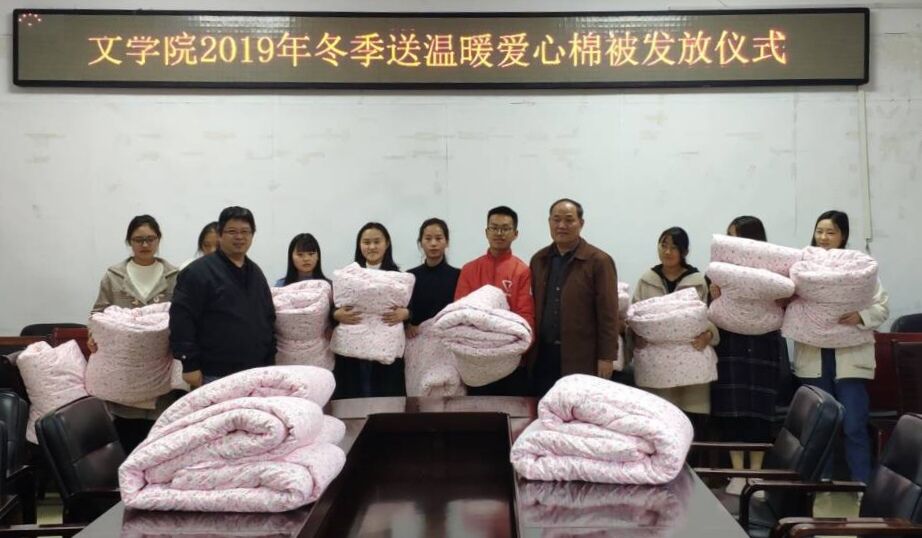 (本网讯 孙晓娜)11月18日下午,我院2019年“寒冬送温暖”棉被发放仪式在人文楼3-11会议室举行。太阳成集团tyc151cc党委书记吴圣刚、党委副书记杨乐出席活动,为家庭经济困难学生发放被褥。