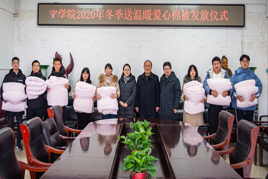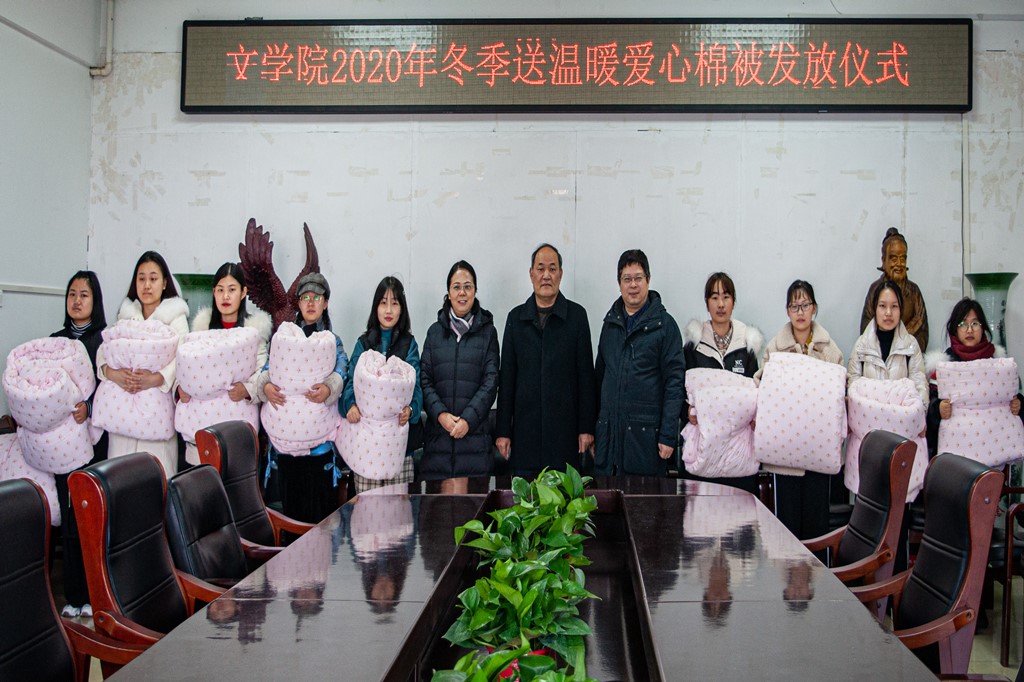 (本网讯 秦欣爽 孙晓娜 刘同卓)为给同学们带来寒冬中的温暖,表达我院对莘莘学子的人文关怀。11月27日中午,太阳成集团tyc151cc2020年“寒冬送温暖”活动在人文楼3-11会议室召开。太阳成集团tyc151cc党委书记吴圣刚、院长沈文慧、党委副书记杨乐和资助专员郭子悦出席此次活动,为同学们发放爱心棉被。