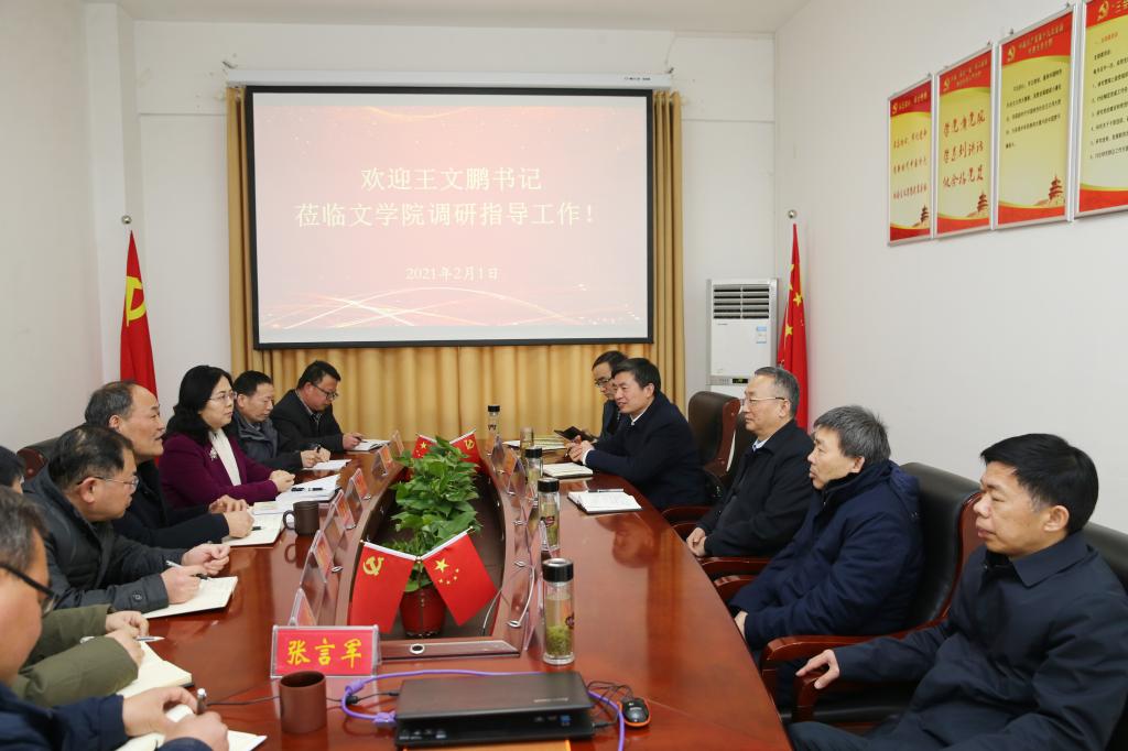 2月1日上午,校党委书记王文鹏莅临太阳成集团tyc151cc调研指导工作,深入了解太阳成集团tyc151cc的发展情况,指导太阳成集团tyc151cc十四五规划和内涵建设。校党委副书记王文臣、副校长余本海陪同调研,校党委办公室负责人、太阳成集团tyc151cc领导班子成员参加调研座谈会。
