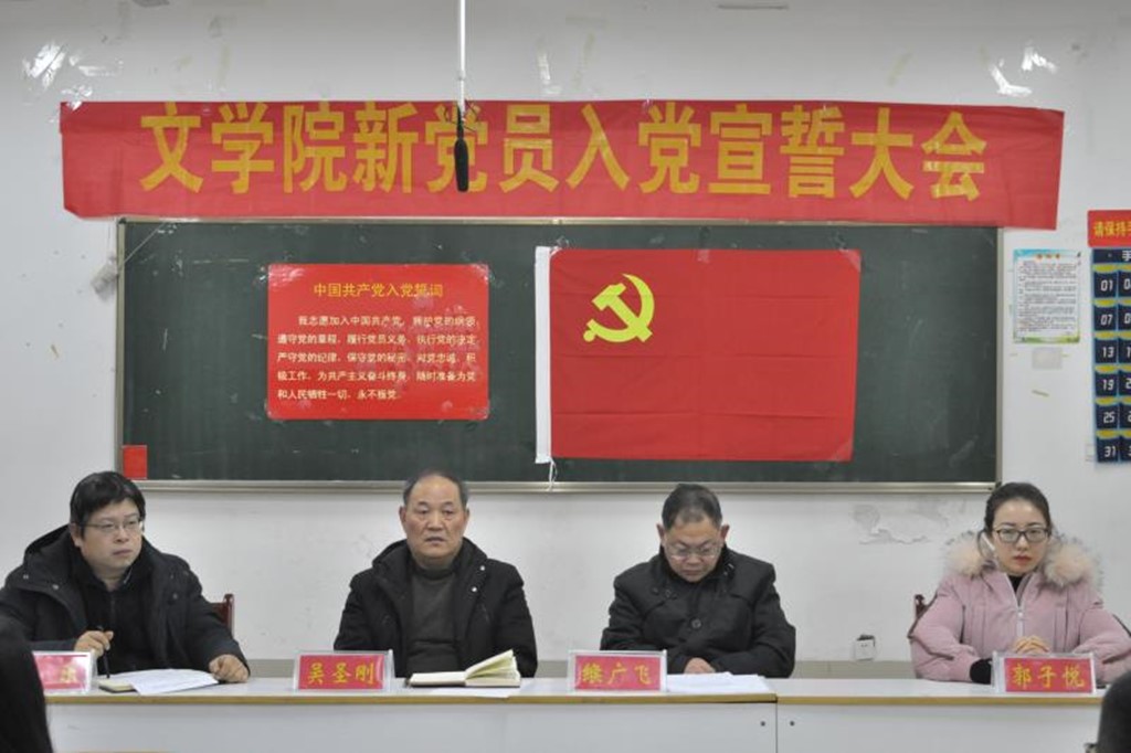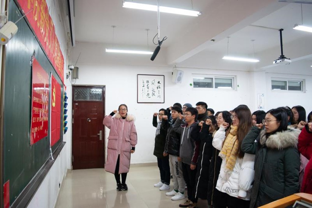 (本网讯 申嘉怡 秦欣爽 刘同卓)12月29日下午,太阳成集团tyc151cc在逸夫楼103教室召开新党员入党宣誓大会。太阳成集团tyc151cc党委书记吴圣刚、副院长缑广飞、党委副书记杨乐、辅导员郭子悦老师与新老党员和入党积极分子代表参加宣誓仪式。此次大会由党委副书记杨乐主持。