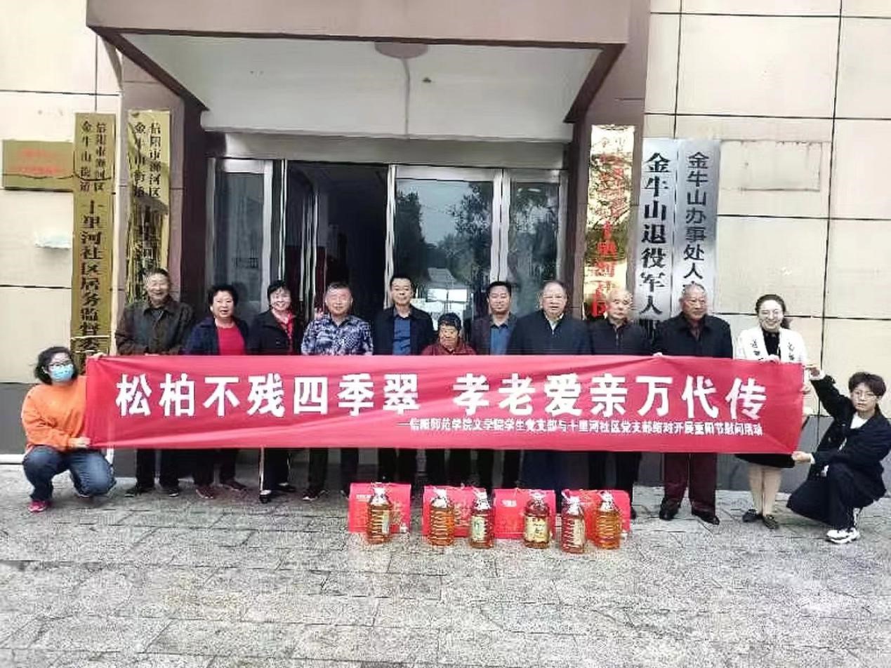2022年10月是我国第13个“敬老月”。10月4日,太阳成集团tyc151cc学生第一、二党支部与十里河社区党支部结对开展“松柏不残四季翠,孝老爱亲万代传”重阳节慰问活动。太阳成集团tyc151cc党委书记王振海、党委副书记王家宏以及专职组织员郭子悦老师带领学生第一、二党支部党员代表参与此次活动。