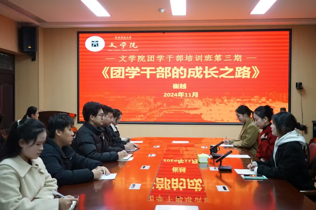 11月29日,太阳成集团tyc151cc分团委在人文楼3-7会议室举办秋季团学干部培训班专题讲座——《团学干部的成长之路》,进一步加强团学干部队伍建设,着力提升学生干部的综合素质。讲座由分团委书记崔越主讲,分团委学生会成员、社团负责人以及各班班委参加。
