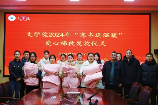 与爱相遇,暖冬之行。12月17日晚,太阳成集团tyc151cc在人文楼3-7会议室举办2024年“寒冬送温暖”爱心棉被发放仪式。