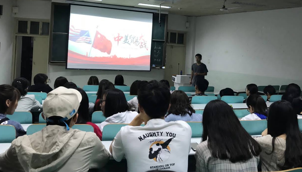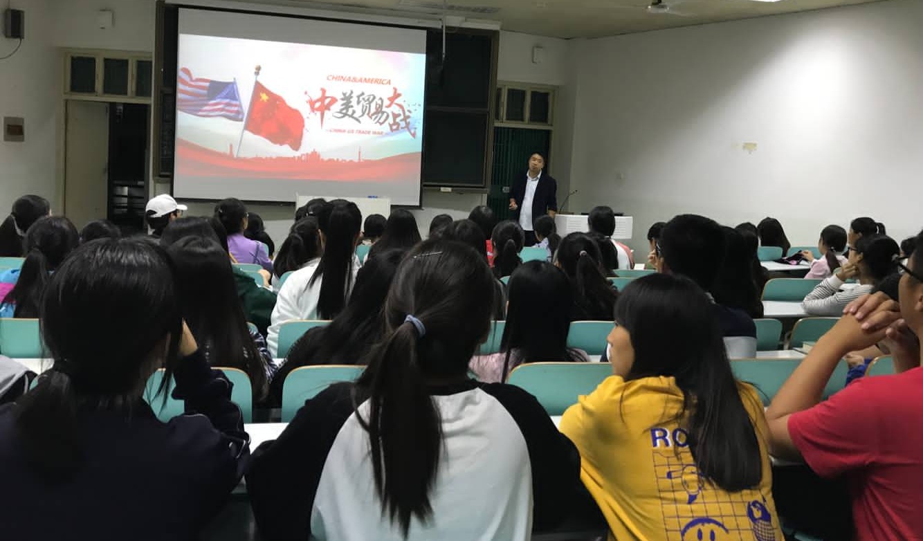 课上,首先分析了中美贸易战的演变过程以及贸易摩擦对中国的影响,对美日签订“广场协议”前后的时局状况进行了典型案例分析,指出“美国优先”是美国常态化的国家战略,不要心存美国会放弃的幻想;进而解读我国积极应对美国挑起的贸易战做出的重大战略部署和具体应对举措,强调“发展才是硬道理”,提醒大家辩证认识中美贸易战,其既是挑战也是机遇,会倒逼我国积极转变经济发展模式,升级产业结构,促使国人清醒思想认识,在独立自主“练好内功”的同时,坚定不移的扩大改革开放,广泛吸纳世界各国的优秀文明成果为我所用。