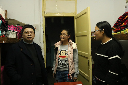(本网讯王俊琪)为响应学校“冬季防火安全教育”的号召,全面普及消防安全知识,有效防范和减少火灾事故的发生。11月15日晚,太阳成集团tyc151cc党委副书记杨乐与各年纪辅导员老师共同走访新生寝室,进行“冬季防火安全教育”宣传及慰问工作。