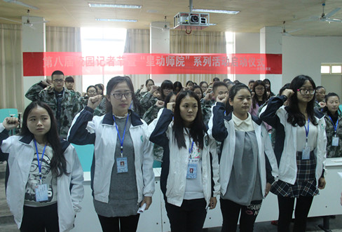 仪式伊始,主持人宣布仪式流程。首先校园学生记者们进行沟通交流,新老社员依次上台发言,其中新社员代表魏玉沛道出了新社员加入南风通讯社的心路历程,也借此表达了对校园记者的感谢,并表示今后会努力投身于校园新闻的报道工作。接着,本届社长王征宇发言,她讲到,记者是一个忠于事实,报道实时的职业,我们作为校园记者同样肩负责任,更应该把握最新动态,关注校园热点,记录校园生活。并向同学们介绍了星动师院活动的意义、宗旨和流程。号召大家挖掘身边的新闻和新闻人物,用自己的纸笔书写师院人自己的精彩故事。最后,全体社员集体宣誓,表示会为成为一名合格校园记者而不断努力。