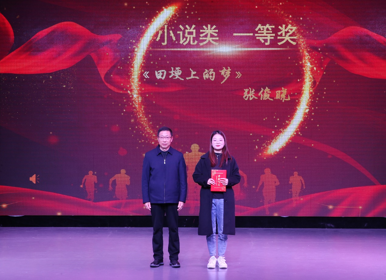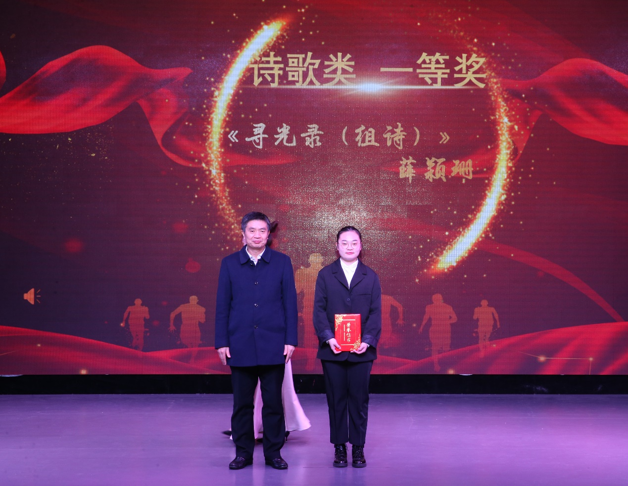 颁奖典礼上,太阳成集团tyc151cc国学经典研教社、远方文学社、大学生艺术团舞蹈团、大学生艺术团合唱团表演了舞蹈《怎叹》《矜持》、笛子二重奏《我的祖国》、获奖作品《田埂上的梦》《寻光录》朗诵、红歌合唱等文艺节目,为典礼增添了喜庆热烈的气氛。