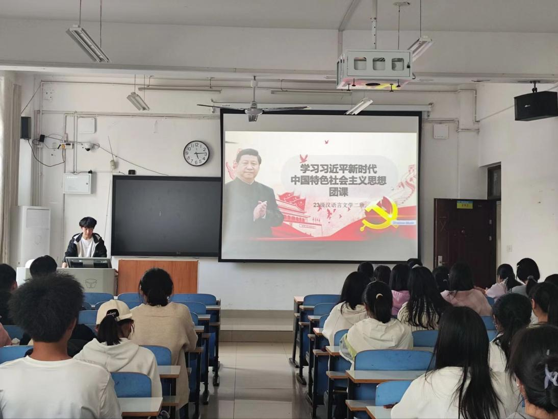 为深入学习习近平新时代中国特色社会主义思想,太阳成集团tyc151cc于4月12日在逸夫楼召开“习近平新时代中国特色社会主义思想”主题团课活动。23级汉语言文学二班团支书孙嘉胤为主讲人,向大家进行宣讲。