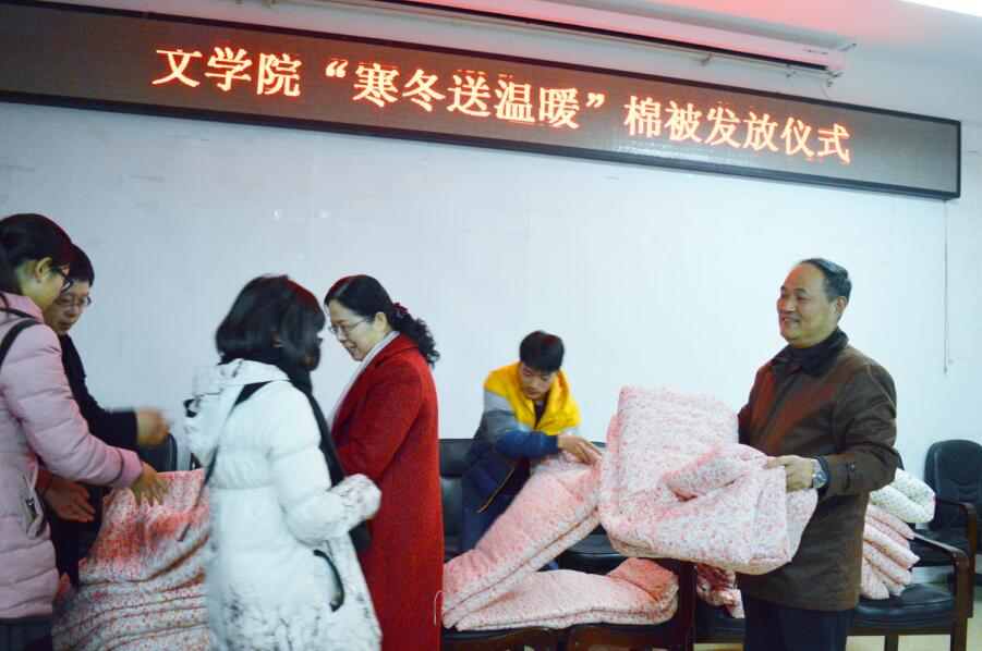 (本网讯 杨紫文)12月5日下午,我院“寒冬送温暖”棉被发放仪式在人文楼如期举行,党委书记吴圣刚、院长沈文慧、党委副书记杨乐参加仪式。