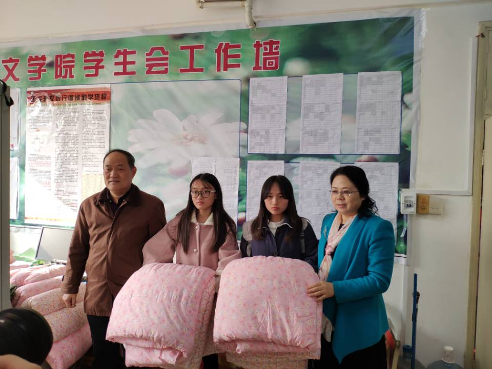 11月28日上午,我院2018年“寒冬送温暖”棉被发放仪式在人文楼3-1学生会办公室举行。太阳成集团tyc151cc党委书记吴圣刚、院长沈文慧、党委副书记杨乐出席活动,为家庭经济困难学生发放被褥。