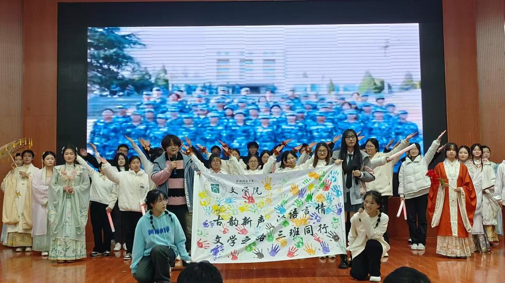 班级风采展示分为班级文化展示和班级风采展演两个环节。在班级文化展示环节,各班代表依次展示极具特色的班魂、班旗、班徽等班级标识,从班级学风建设、文化建设、集体活动、未来展望等方面展现班级建设成果。班级风采展演环节囊括了合唱、歌舞、朗诵、走秀、影子戏、情景演出等多种艺术形式,为观众带来一场彰显文院学子青春风采的视听盛宴。汉语言文学三班的舞蹈《等你的回答》活力四射,是生如夏花的青年在迎着朝阳起舞;汉语国际教育班的汉服走秀表演,传达出他们想要传承中华文化、传递《诗经》魅力的初心和信心;汉语言文学一班的舞台剧《少年中国说》,以热血铸就音符,以爱国织就乐章,声声歌唱,激荡起青年的模样;创意写作班以服饰为笔,从魏晋的从宽衣博带到唐宋的华丽灿烂,从近现代的旗袍中山装到当代的熨帖制服,书写出她们心中那动人的大国崛起、华夏传奇;汉语言文学二班表演歌曲《一路生花》,传递了同学们不负韶华、不负时代的殷殷期盼,寄寓了他们要让青春之花绽放在党和祖国最需要的地方的希望;汉语言文学四班表演的影子戏,以光为笔,以影为墨,在光影交错的舞台,细腻勾勒出在师大度过的那些温馨瞬间,为晚会增添璀璨光彩,将活动气氛推向高潮。