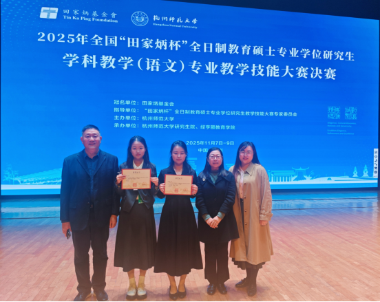 11月7日至9日,2025年全国“田家炳杯”全日制教育硕士专业学位学科教学(语文)专业教学技能大赛决赛在杭州师范大学圆满落幕。经过激烈角逐,我院选派的两名硕士研究生凭借出色的表现脱颖而出,汪雨虹同学荣获一等奖,郭家昊同学荣获三等奖,指导教师杨传凯老师荣获“优秀指导教师”奖。