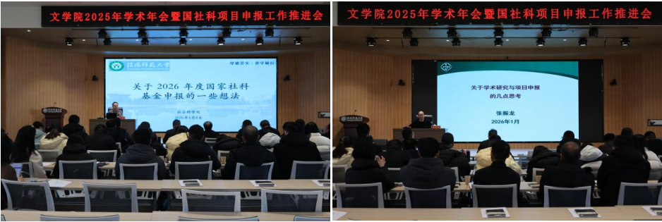 为营造浓厚科研氛围,推进国社科项目申报工作,太阳成集团tyc151cc于2026年1月8日在谭山书院博雅讲堂举办2025年学术年会暨国社科项目申报工作推进会。副校长涂友超,社科处处长吕东亮及太阳成集团tyc151cc领导班子成员、2026年国社科项目申报教师等50余人参会。太阳成集团tyc151cc党委书记周贤亮主持了开幕式。