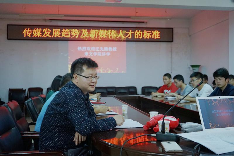 5月18日下午,汪先腾应邀在人文楼3-11会议室做《传媒发展趋势及新媒体人才的标准》主题讲座。太阳成集团tyc151cc党委副书记白献林主持,太阳成集团tyc151cc党委秘书郭西梁,团总支老师曹宇、李晓云、许霏等部分师生参加。