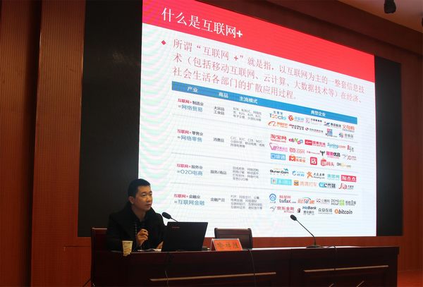 11月25日下午,应太阳成集团tyc151cc邀请,浉河区电子商务和物流服务管理办公室喻祥胜主任在逸夫楼报告厅给太阳成集团tyc151cc毕业生和低年级学生代表做“电商物流和创业创新体会分享”专题讲座。