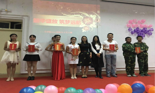 本次大赛集舞蹈、歌曲、乐器独奏等多种艺术形式于一体,内容丰富,精彩不断。随着开场舞的激情上映,大赛正式拉开了帷幕。歌曲《春暖花开》,旋律曼妙,柔情满溢,表达了对同学们的勉励之情,并希望他们能够热爱生活、温暖人间。二胡独奏《奔驰在千里草地上》和古筝独奏《战台风》,尽显古色古韵,演员们用婉转的节奏和饱满的感情,再现了曲子的内涵和场景。朗诵《我的南方和北方》,语调抑扬顿挫,感情真挚饱满,自然流露出对故乡、祖国深沉的爱,具有较强的影响力和感召力,直接把晚会的气氛推向高潮。小品《一根头发》,诙谐幽默,表现力强,让同学们在欢声笑语中,细细品味爱和温情,赢得了阵阵掌声,受到了师生的广泛好评。大赛步入尾声的同时,各代表人员已通过公开、公正的投票,评出了不同级别的获奖节目,李晓云、许霏老师上台为选手颁奖,并合影留念。