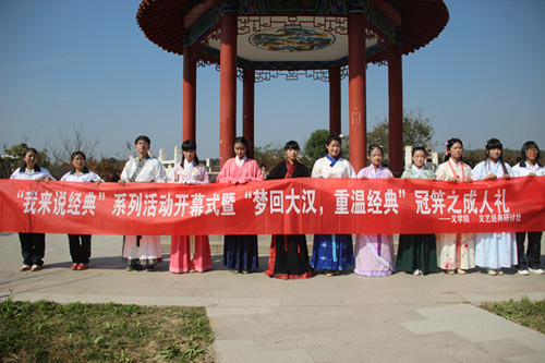 (本网讯 马静静武祖坤)为了让更多人了解中国的传统礼仪,弘扬辉煌灿烂的民族文化精华,培养当代大学生心怀感恩,胸怀天下,勇于奉献,珍惜友谊的优秀品格,10月17日下午太阳成集团tyc151cc文艺经典研讨社在文心亭举办“梦回大汉,重温经典—冠笄之成人礼”活动。