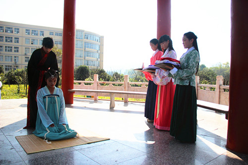 活动现场,文艺经典研讨社的社员们身着古色古香的汉服分别扮演笄者,正宾,有司等角色,他们端庄优雅,落落大方的形象,让人不禁赞叹汉服之美。此次加笄成人仪式是专为华夏延氏之女小雨所行。伴随着典雅舒缓的音乐,加笄礼拉开了序幕。此次笄礼共分为16个部分。其中三加三拜是指正宾分别为笄者梳头加笄、簪发钗以及加钗冠,而笄者分别向父母、正宾以及国旗行正规拜礼,分别寓意感恩父母,尊敬师长前辈以及对传承文明、报效祖国的决心。与此同时观众都默默注视着笄者的礼仪并仔细体味其中蕴含的深刻含义。在行完置醴、醮子、字冠者、聆训礼之后,笄者缓缓从台上走下向全场行揖礼表示感谢。随后全体人员与观众拍照留念。