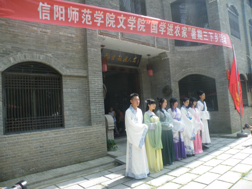 微风扑面如嗅十里荷花芬芳,暑期下乡如触半池泉水清凉,一路上伴随着师生的欢歌笑语,社会实践活动之“国学进农村”也正式拉开了帷幕。此次活动由我院文艺经典研讨社主办,上午九时许,志愿者们到达郝堂村后,迅速做好准备工作开始进行汉服展示。演员们身着汉服,头戴发簪,穿梭于大街小巷,进行汉民族服饰宣传,尽显古典古韵,吸引了众多游客和村民驻足领略汉民族传统服装之美,并纷纷与之合影留念。其它志愿者们则抓住时机,与群众深入交谈,大力宣传国学经典,积极做中国优秀传统文化的继承者和传播者。接着,表演者们在杨凡老师的带领下,紧扣信阳名茶特色,在古韵古律的优雅环境氛围中中进行茶艺展示,带领观众共同领悟“廉俭有德,美真康乐,和诚处世,敬爱为人”的茶道精神,深入感受国学博大精深的内涵和超越世俗的境界。最后,主持人对汉服进行了详细的解说并帮助在场观众答疑解难。本次活动紧贴农村实际,内容丰富,形式多样,将汉服展示、汉服解说、茶艺表演融为一体,充分利用校内外各种资源,具有较高的欣赏和学习和实用价值.