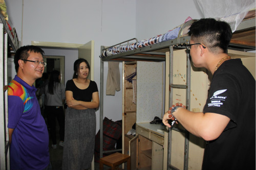 白献林书记一行先后参观了女生宿舍和男生宿舍。每到一处,白献林书记都仔细地帮同学们解答学习和生活中的各种问题,并就信阳的气候特征对同学们提出贴切的建议,提醒他们有意识地保护人身和财产安全,以免上当受骗。面对学院领导的莅临,亲切的叮嘱,同学们很快便与领导热情地互动了起来,纷纷表示会尽快适应大学生活,努力学习。