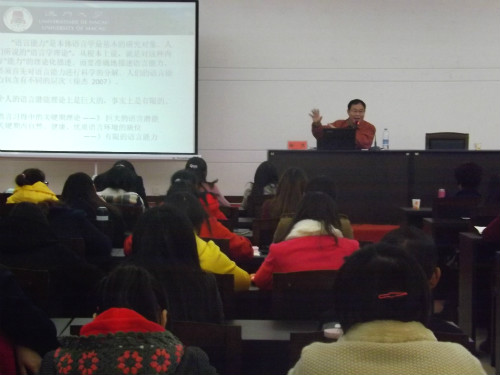 作为一名河南籍教授,徐杰轻松幽默的口吻、亲切近人的语调,使现场气氛始终轻松愉悦。他首先谈语言潜能对外语学习的影响,他讲到,语言潜能是影响外语学习的重要因素之一,而语言学习者之间存在的巨大个体差异,也使语言学习因人而异。根据学习者不同的语言潜能采用与之相匹配的教学法进行教授,可收到良好的教学效果并使学习者从语言学习中获得更多的自我满足。他辅之以鲜活生动的事例,讲述英语学习的语言潜能和学习方法,使在场师生获益匪浅,报告厅内顿时掌声雷动。接着,他谈及语言配套的重要性,他提出语言课程要适当选择,不能盲目跟风。此外,他针对许多学生提及自身英语学习困难,或者不喜欢学习语言学专业,或者只是为考证而学习的诸多问题,结合自身实例,讲述英语学习的重要。他细致入微的讲解、幽默风趣的语调、别具匠心的答辩推动现场气氛走向高潮。他认为学无止境,特别是当他说起,他现在还孜孜地学习英语,观众都唏嘘不已,掌声经久不息。