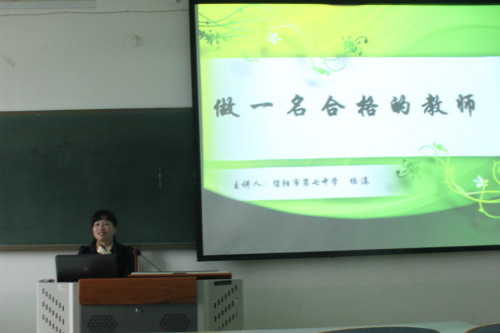 杨漾紧扣报告会主题,从教师的现状与职业认知、教师的爱与幸福、教师的责任与师德、教育的智慧和教师的成长五个方面展开全面讲解。她简要介绍了信阳地区的教师教育现状,结合自身三十九年的从教经历,指出教师职业面临的工作时间长、教学任务繁重、多学科任教等一系列问题。她强调,为学与做人并重,教育的价值是培养学生,帮助学生塑造健全的人格。为实现教育的价值,教师必须具备良好的思想品格和道德的修养,课上要充当传递知识的使者,课下要做好为人师表的典范。杨漾认为教师要有责任心,只有教师的勤奋才能鼓励学生的勤奋,只有教师的言传身教才能调动学生的学习积极性和主观能动性,同时,教师要选择正确的教育方法,积极与学生交流,理解并包容学生,作学生思想的向导,使他们从知之不多走向知之甚多。作为一名合格的教师,既然选择教师职业就要脚踏实地地走下去,树立教师的崇高信仰,追求教师的高尚情操,成就教师职业的辉煌。她引用以爱心育人著称的教师斯霞的故事,彰显教师无私奉献、爱岗敬业的高尚品格和光辉形象。杨漾深刻睿智的讲话、幽默风趣的语言、鞭辟入里的分析赢得在场师生的一致好评,现场掌声不断。