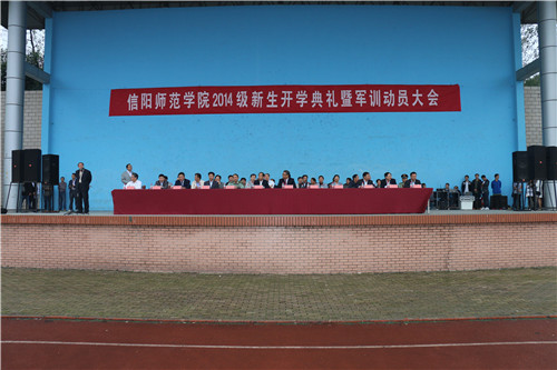 (本网讯倪培常静余怡楠)9月13日,细雨蒙蒙。为了迎接新同学及引导新生上好开学第一课——军训,信阳师院在校党委副书记高建社的主持下顺利召开2014级新生开学典礼暨军训动员大会。校党委书记孙宏典、院长卢克平、承训部队解放军71872部队副政委黄华军及各学院相关领导共同出席此次会议。