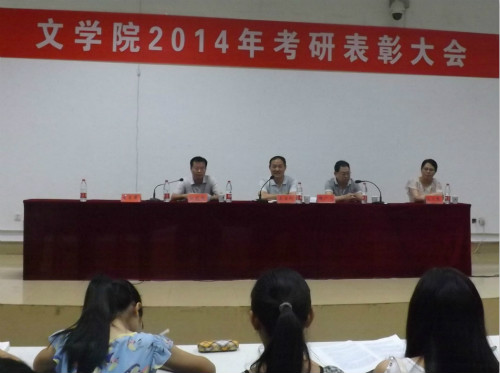 大会伊始,缑广飞宣读我院2014年考研表彰学生名单,对考取北京师范大学、苏州大学和兰州大学等高校的65名研究生进行表彰。接着,考研学生代表杨阳、张曼和张艳红结合自身考研经历依次做了精彩的发言,与在座师生交流考研心得和体会。他们指出,用心学习,努力奋斗,坚定理想信念,保持良好心态是考研成功的重要因素。其中,杨阳讲到,考研同学首先要学好本专业课程,慎重选择报考学校和专业。同时,要保持信息畅通,以便及时了解更多的考研动态。他幽默风趣的发言赢得观众的阵阵掌声。张曼特别指出了考研备考阶段的时间管理问题。她说,时间紧迫,学习固然重要,但身体健康也是不容忽视的,劝告同学要劳逸结合,心情舒畅。之后,张艳红就自己考研决心和乐观心态向观众介绍了自己的考研之路,引得观众的连连赞叹。
