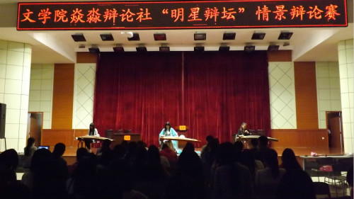 辩论赛在轻柔和缓的古筝弹奏《青花瓷》中拉开帷幕。为突出辩论社特色,此次辩论赛创新原有辩论赛形式,将情景剧与辩论赛相结合,一改原有辩论赛严肃的面貌,使得整场辩论赛精彩绝伦,高潮迭起。在第一场辩论赛“猪八戒和孙悟空那一个更适合做老公”中,身着正装、士气高涨的辩手们依次做简明扼要的自我介绍后正反方展开激烈辩论。正方辩手通过对猪八戒和孙悟空的外貌、能力、性格三方面进行比较得出“孙悟空更适合做丈夫”的结论,而反方则认为猪八戒更能为家庭稳定提供必要的物质基础,带给妻子更多的精神满足,因此更合适做丈夫。辩论中正反方辩手各持己见、据理力争,紧抓漏洞、极力反驳。攻辩环节中,攻方言辞犀利、问题刁钻、针锋相对,而辩方以退为进、接连反攻,步步逼近,双反辩得不可开交。自由辩论更是将全场氛围推向高潮,辩手们诙谐幽默的语言、灵活巧妙的现场发挥引得在场观众捧腹大笑、掌声不断。第二场辩论赛 “大学生应该花更多的时间努力学习还是穿着打扮”同样精彩纷呈。专注读书的学霸方和花枝招展的美女组一经上场就令人耳目一新、兴致十足。正方学霸认为大学生理所当然地应该花更多的时间努力学习,而反方美女们则理直气壮地坚持对大学生而言穿着打扮比努力学习更重要。双方辩手的伶牙俐齿、绝妙口才、独到见解、大胆想法、精湛演技、逗笑表演,将辩论与情景完美融合,带给观众一场别开生面的视听盛宴,台下欢笑声、喝彩声、掌声不绝于耳。