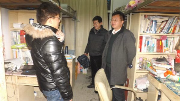 在走访过程中,白献林一行人每到一处都仔细查看寝室设施,亲切地跟同学们交谈。在看到大部分同学已经拿到新课本,并着手预习工作时,白献林书记很高兴,他说,各位同学要尽快调整作息,万事开头难,开学第一天一定要把握时间,不能迟到,调整状态迎接新学期的学习。辅导员老师关切的话语,瞬间拉近了师生之间的距离,也让在场同学深切地感受到了大家庭的温暖。同时,他还嘱咐同学们注意财产安全,遵守用电规范,定期打扫宿舍卫生,为学习生活提供安全、舒适的环境。同学们对领导老师的关心表示感谢,并积极汇报自己的学习、生活及思想状况。期间,一行领导老师们语言幽默风趣,跟同学们闲话家常,宿舍区不时传出同学们的阵阵笑声。在了解到少部分学生未能及时返校的情况后,白献林嘱咐各班班长与他们保持联系,时刻掌握未返校学生动向,确保每位同学都能安全返校。